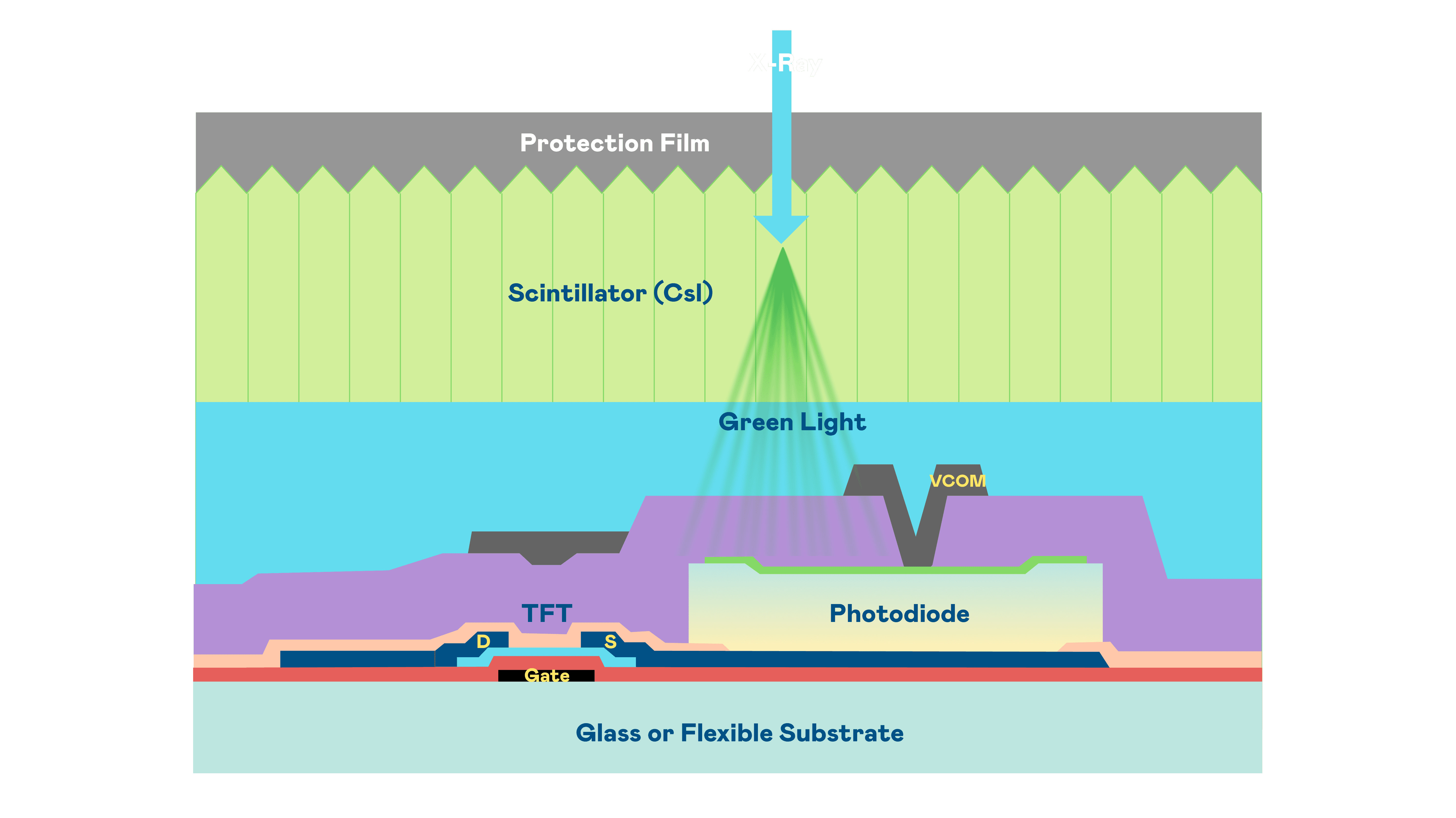 william威廉中文官网的X光影像感测阵列使用薄膜电晶体 (TFT) 作为每个像素的读取开关,,搭配光电二极体(Photodiode)的光电转换元件,,用以感测X光影像讯号。。。